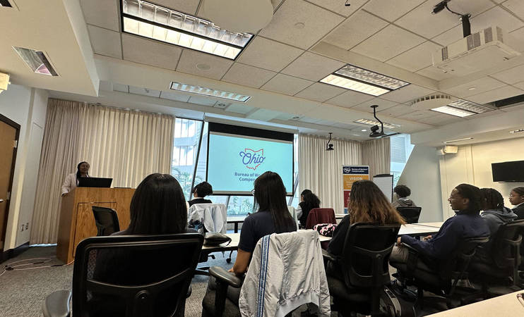 Outside of the impact that Ohio BWC is making at the local level in Cleveland, Columbus, and Cincinnati, they are also fostering collaboration and teamwork across students at all three schools. Every week, the company facilitates a virtual meeting with students from all Cristo Rey Ohio schools where they discuss research articles as well as work on a combined presentation about their Corporate Work Study experience. This project culminated in April when students from Saint Martin de Porres, Cristo Rey Columbus, and DePaul Cristo Rey in Cincinnati traveled to Columbus to showcase their final presentation to the Ohio BWC’s Board of Directors, Senior Leadership Team, and staff members. This collaborative initiative not only allowed students to work together with their peers from other Cristo Rey Schools but also provided them with a platform to share their experiences. During these presentations, students articulated their Corporate Work Study journey with Ohio BWC, elucidating the valuable lessons they've gleaned from their time there.